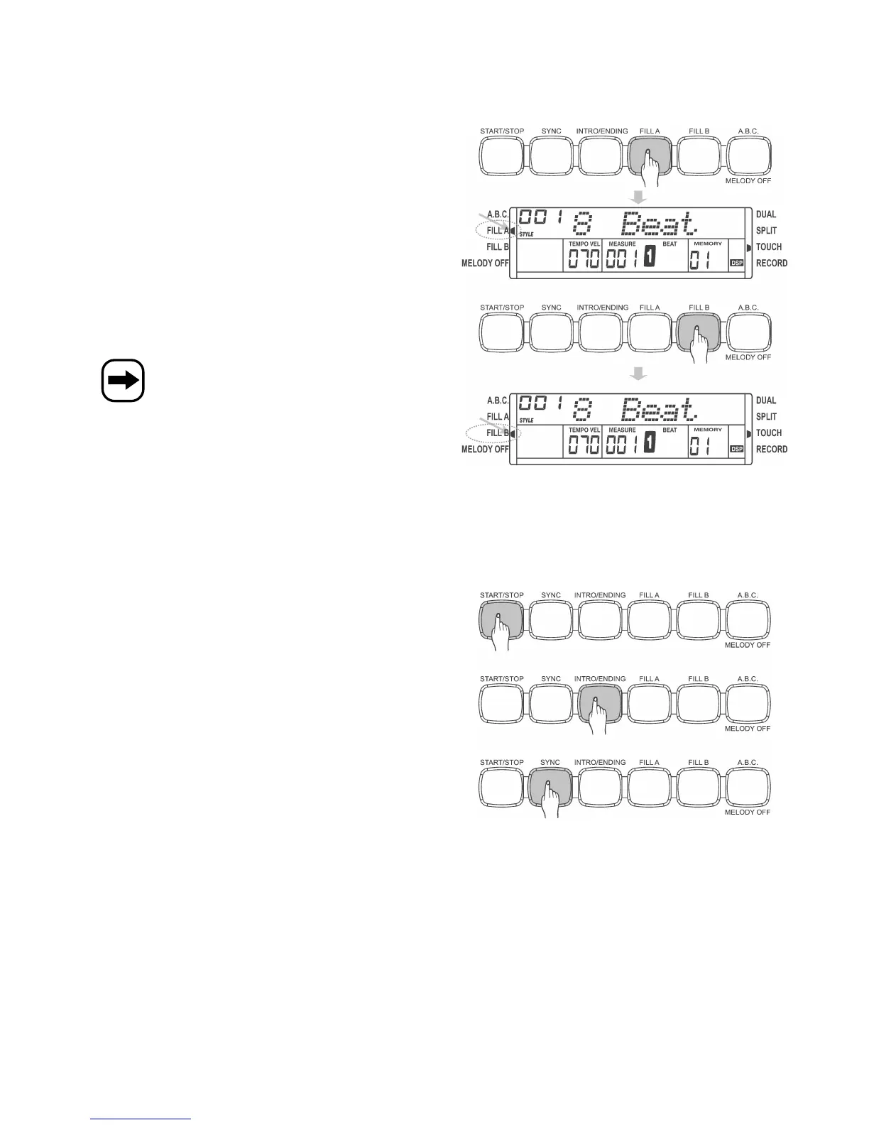 Jeder Begleitrhythmus hat zwei verschiedene Variationen („A“ und „B“). Normalerweise ist Version „A“ (Normal-Modus) einfacher ausgelegt