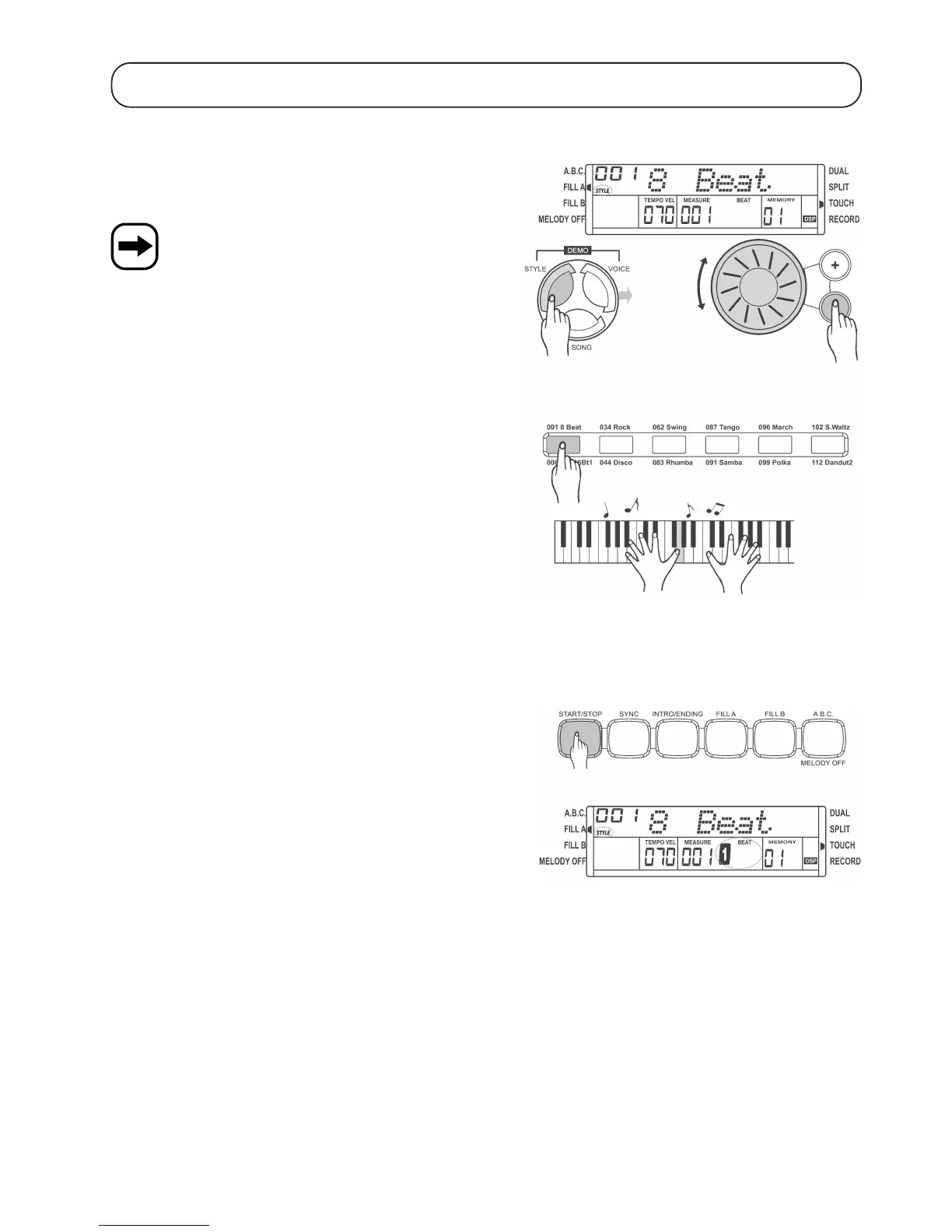 • Use the „START/STOP“ button to activate the accompaniment rhythm