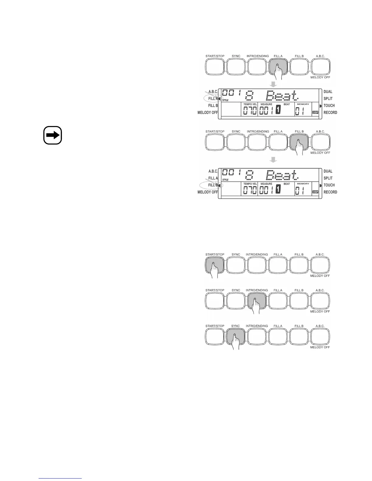 • Press the „FILL B“ button in normal mode („A“) to play a fill and then