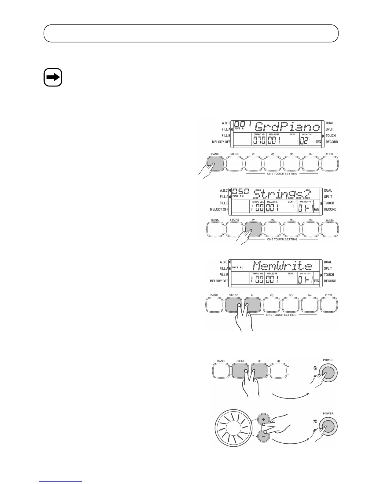 Hold down the „STORE“ button and press „M1“, „M2“, „M3“, or „M4“.