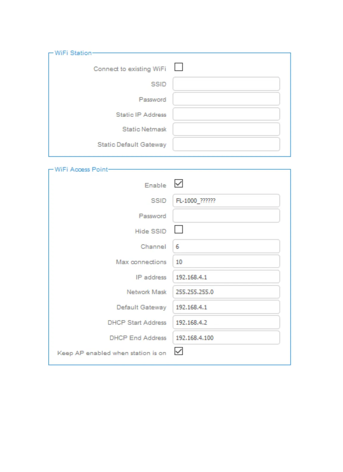 MC Smart Controls FL-1000 - Communications Configuration Settings; WiFi Station Network Setup; WiFi Access Point Setup