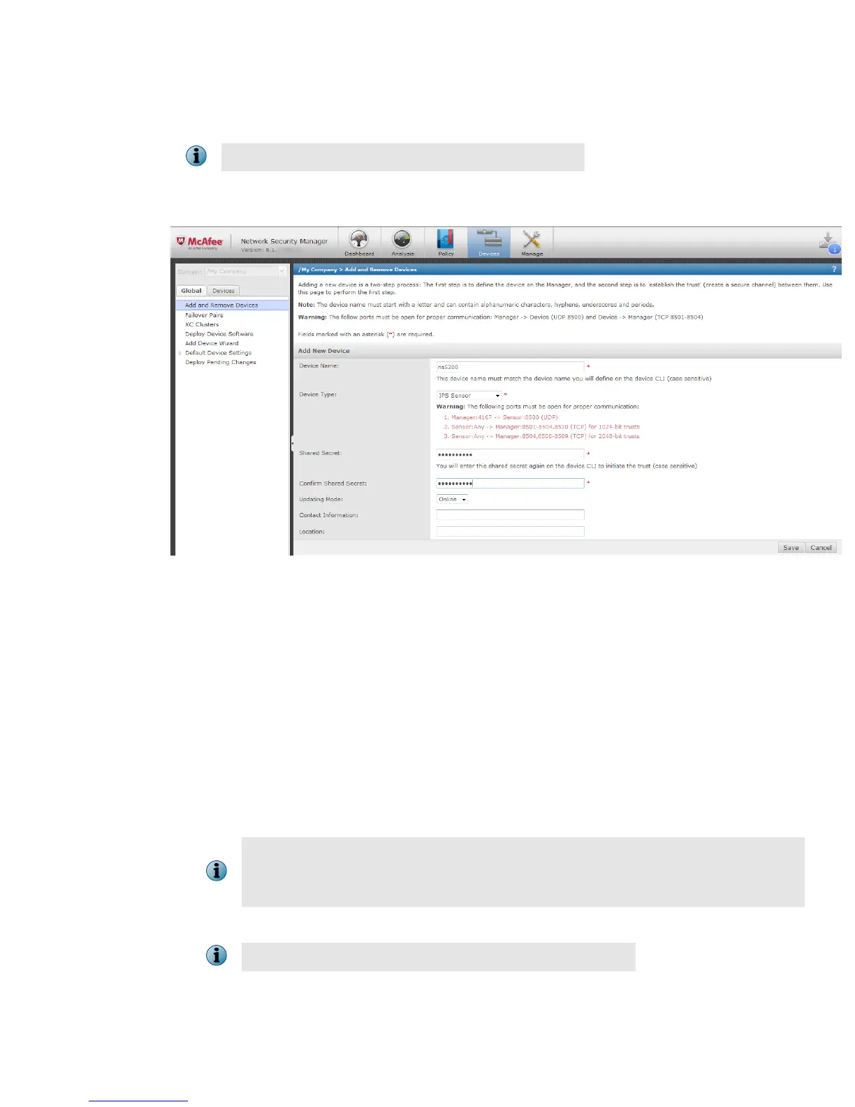 The Sensor name and shared secret key that you enter in the Manager must be identical to the shared