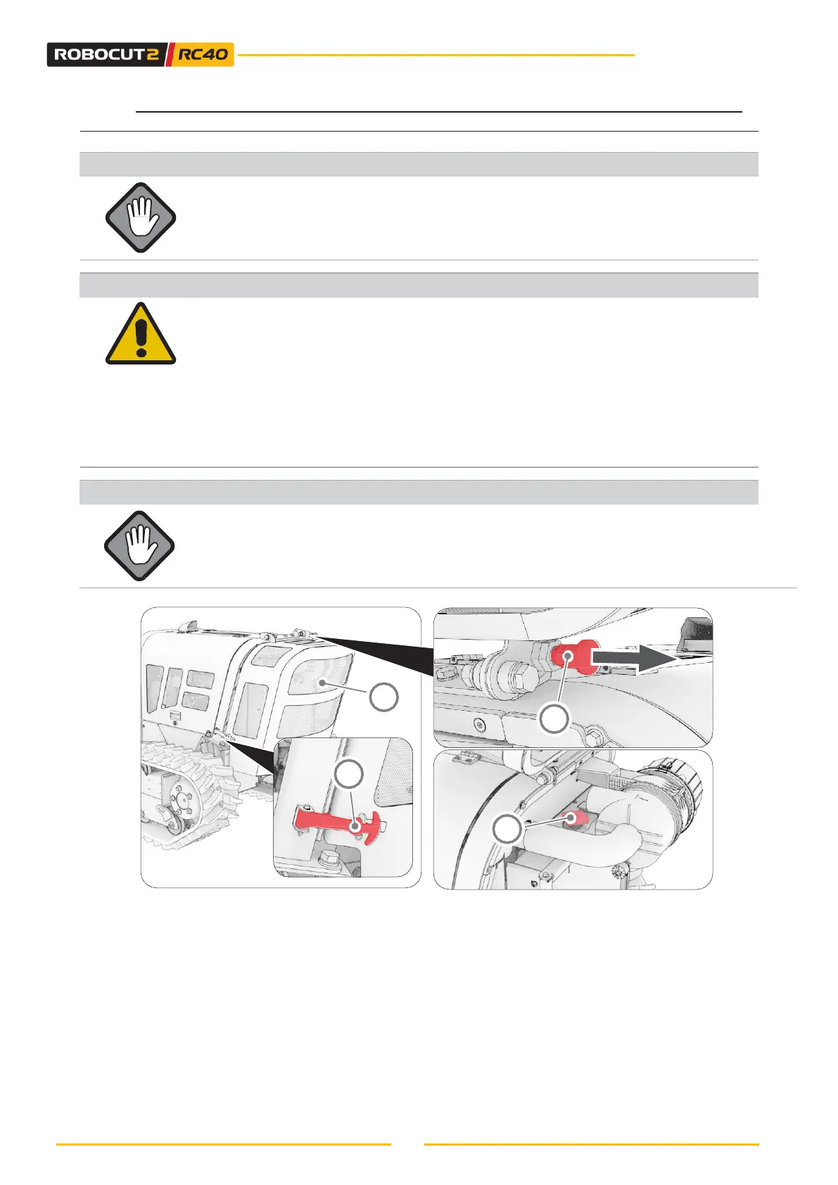 6. Pull the locking pin (C). Lower the bonnet (A) and block it with the two stay rods.