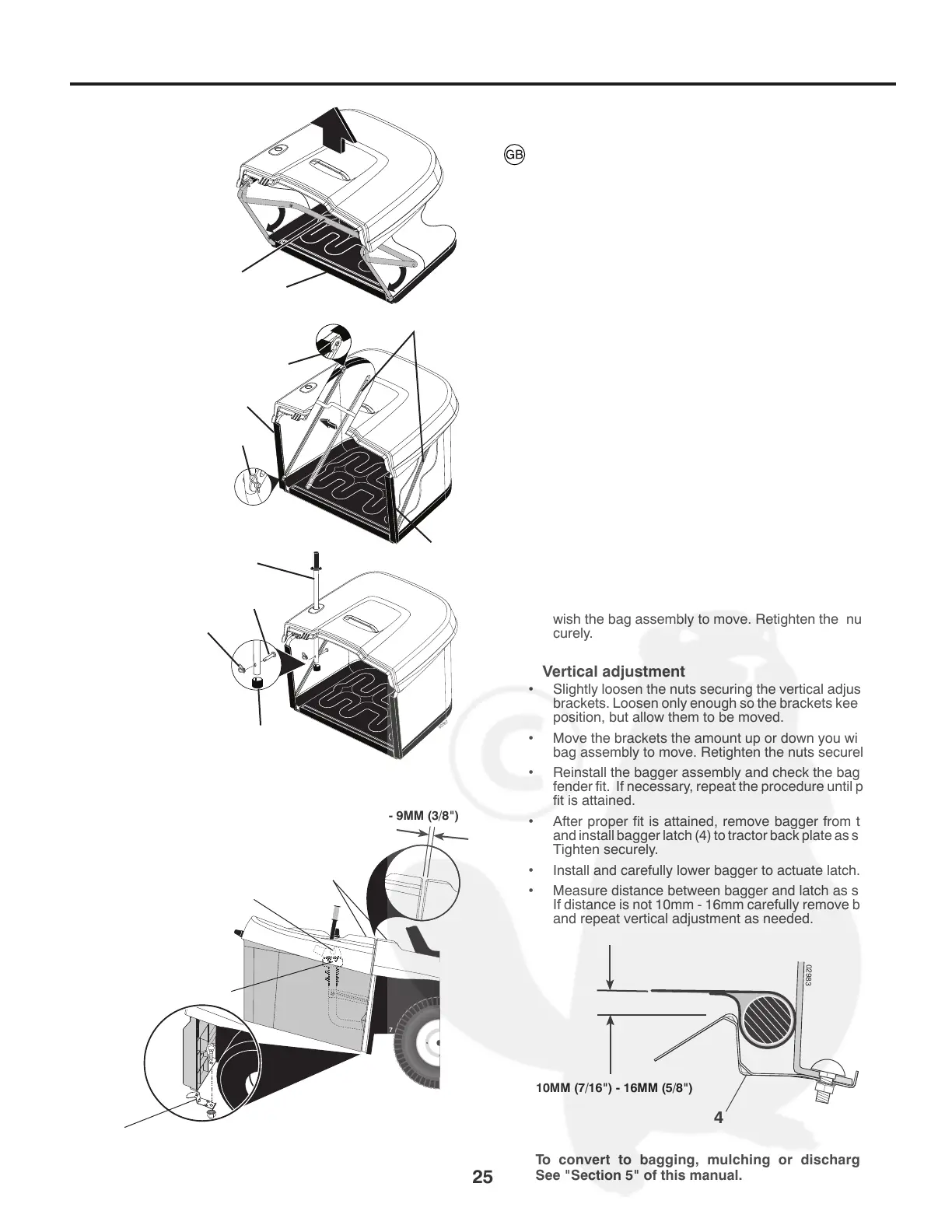 (1/4")-9mm (3/8") gap between the bagger top and fender and