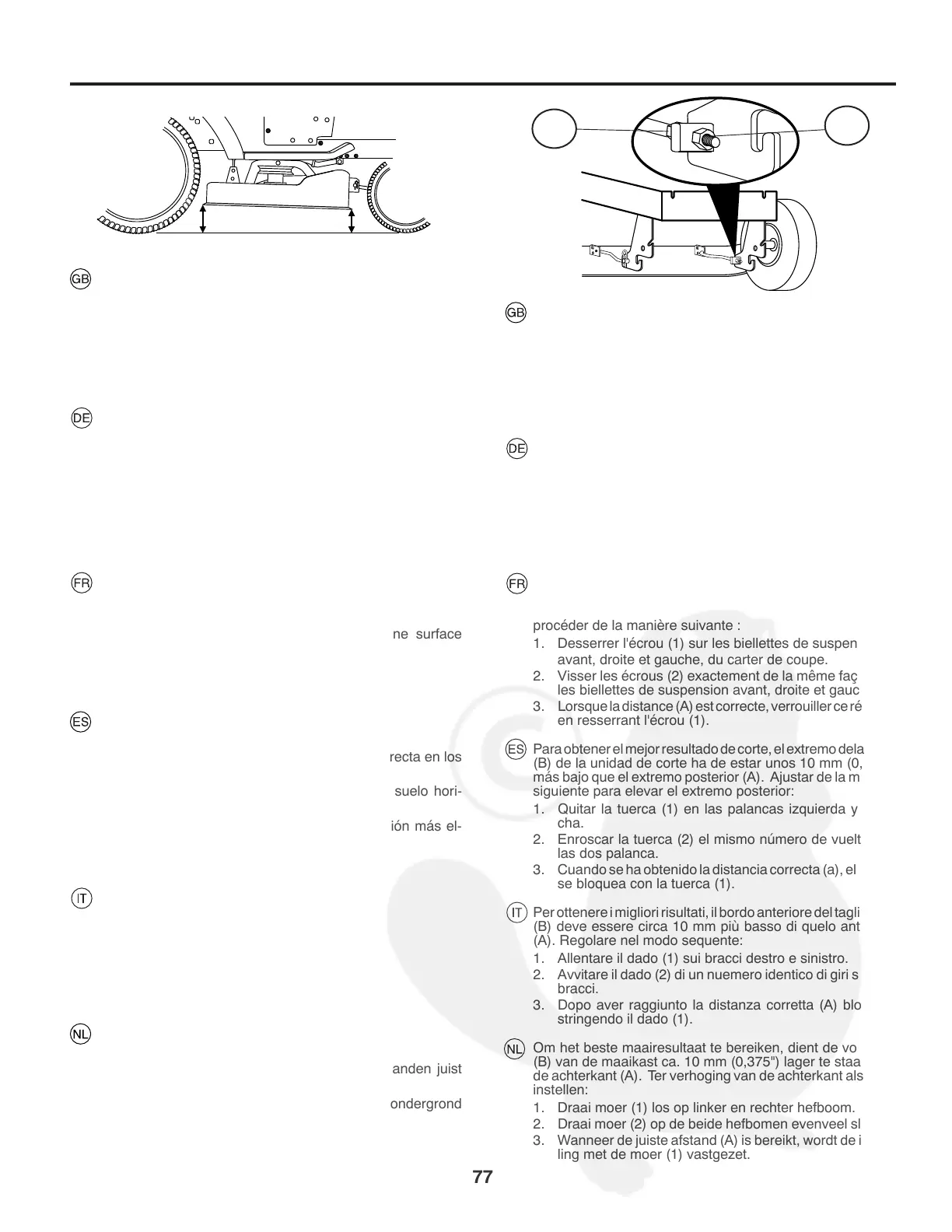 (B) van de maaikast ca. 10 mm (0,375") lager te staan dan