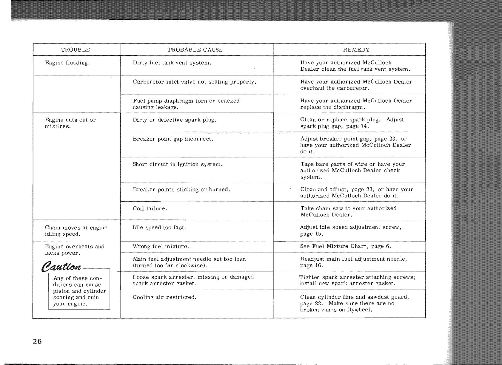 McCulloch 250 - Engine Flooding; Engine Cuts Out or Misfires; Engine Overheats and Lacks Power