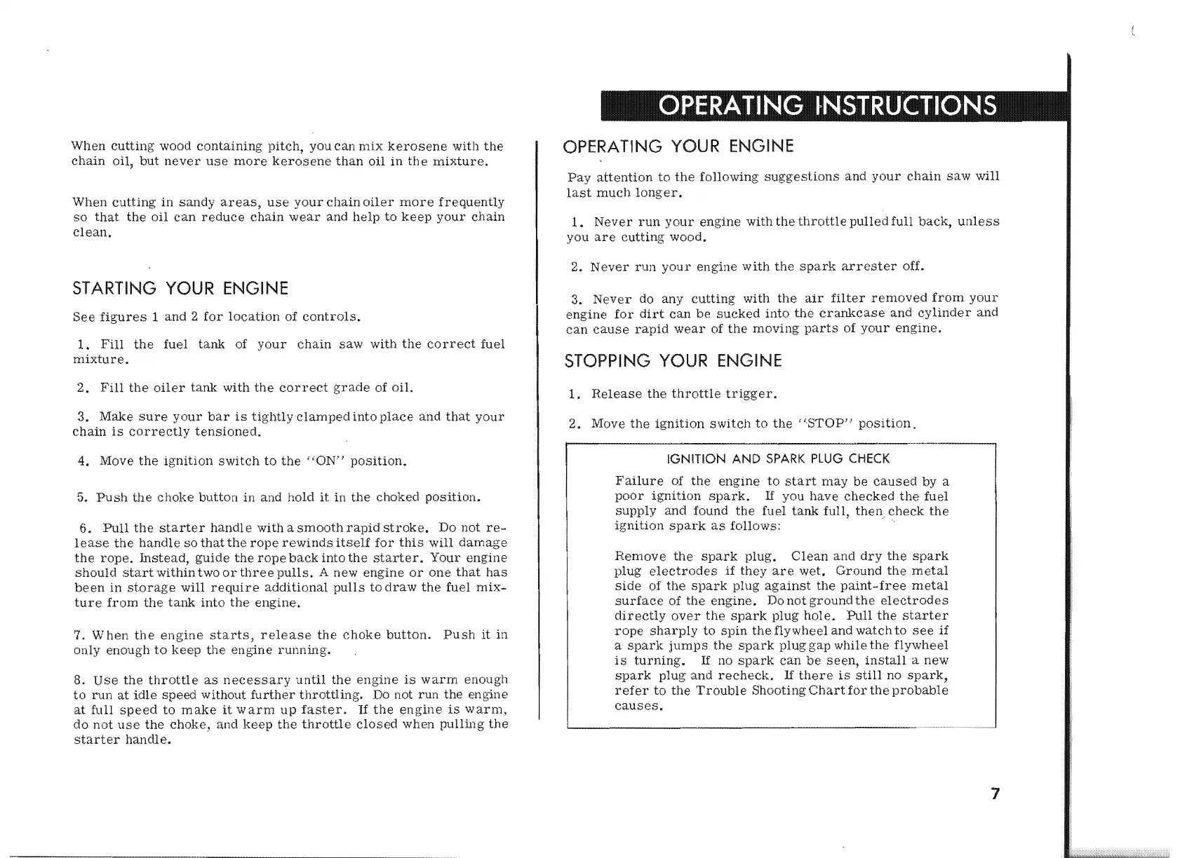 McCulloch 250 - OPERATING YOUR CHAIN SAW; STARTING YOUR ENGINE; STOPPING YOUR ENGINE; IGNITION AND SPARK PLUG CHECK