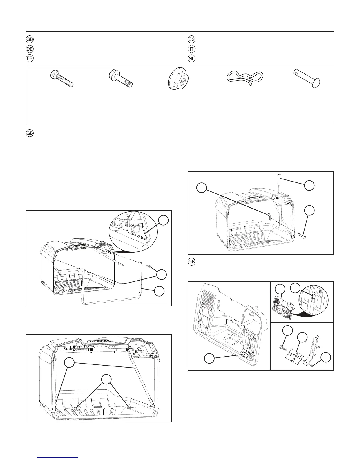 at top of the front bagger frame and thread into nuts inside