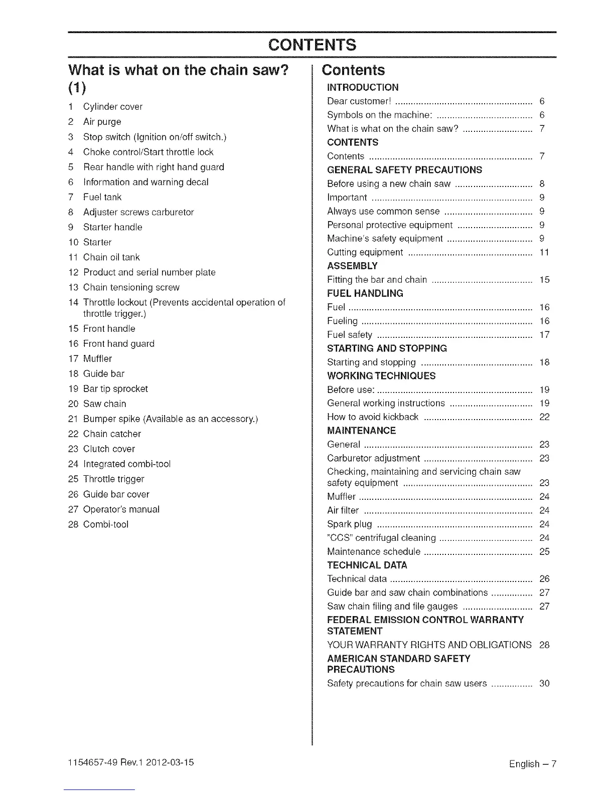 Safety precautions for chain saw users ................ 30