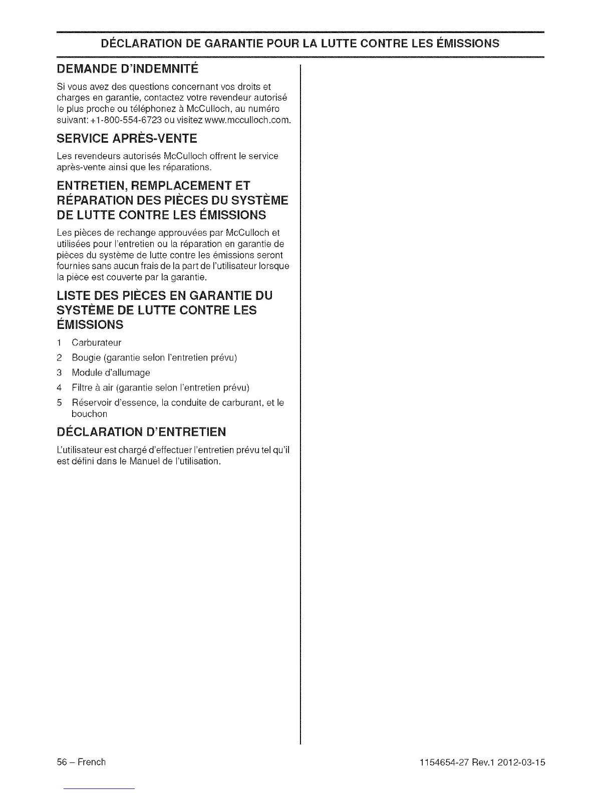 suivant: +1-800-554-8723 ou visitez www.mcculloch.com.