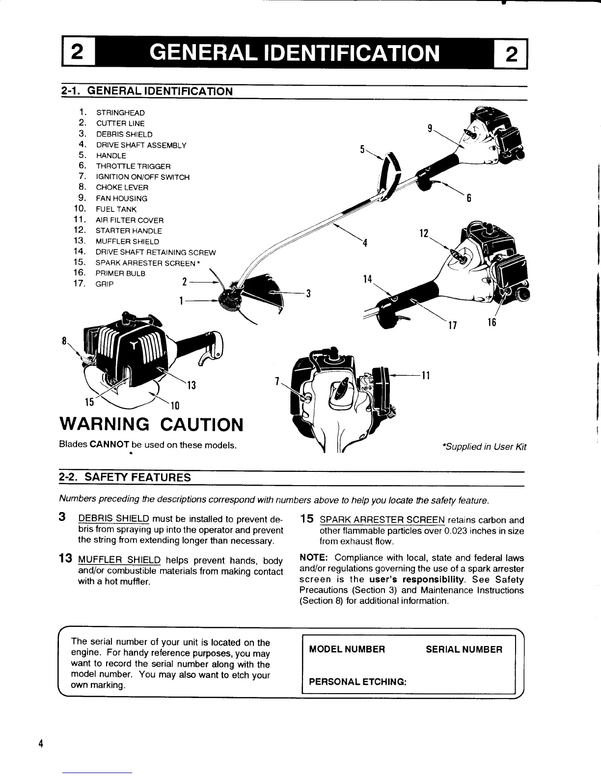 McCulloch EAGER BEAVER 28 - General Identification of Trimmer Components; Identifying Trimmer Parts; Key Safety Features of the Trimmer