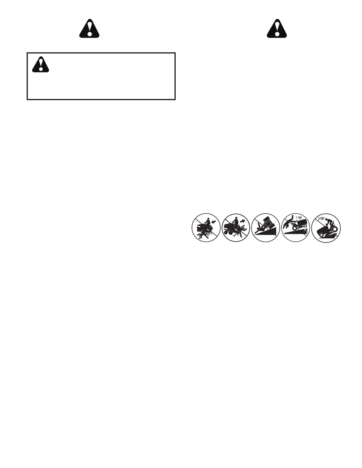 • Avoid starting, stopping, or turning on a slope. If the tires