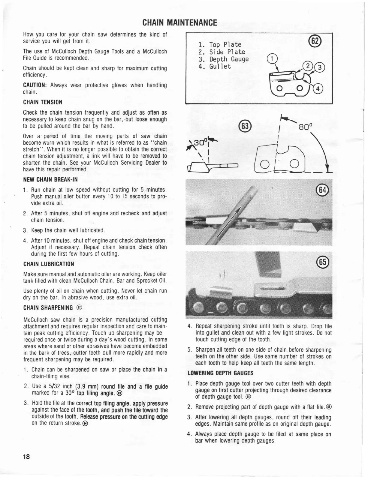 McCulloch Mac 120 - Chainsaw Chain Care; Chain Tension Adjustment; New Chain Break-In Procedure; Chain Lubrication