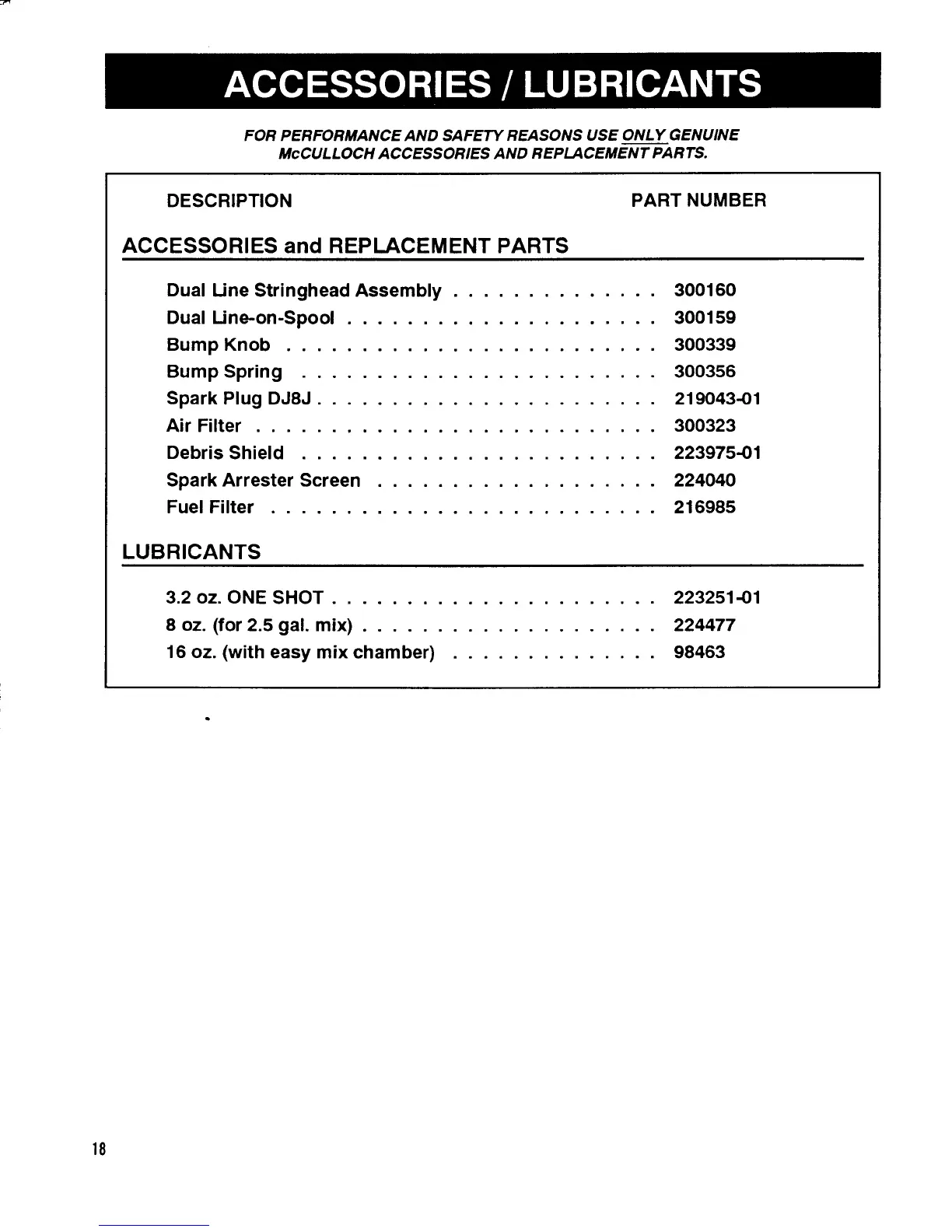 McCulloch MAC 291 - Accessories and Replacement Parts