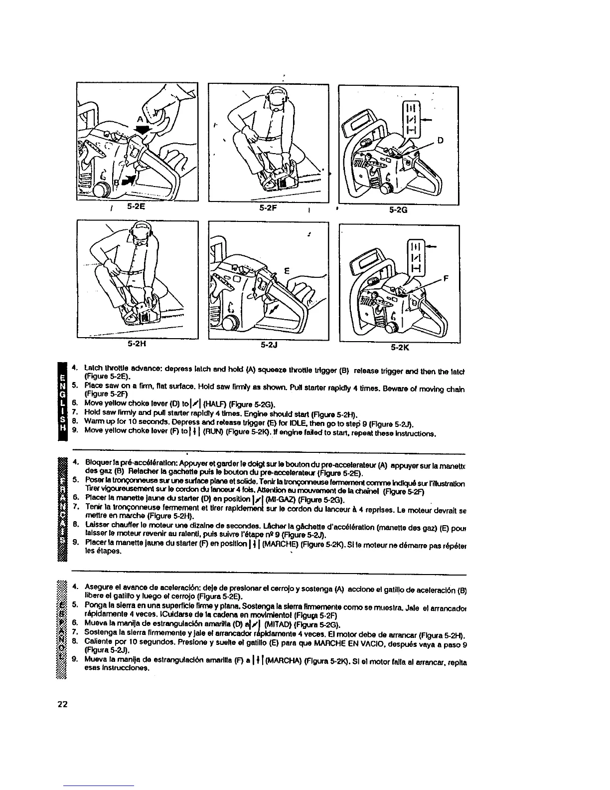9. Placer la manette jaune du starter (F) en position I | I (MARCHE) (Rgure 5-2K). SI le moteur ne d_marre pas r_p_ter