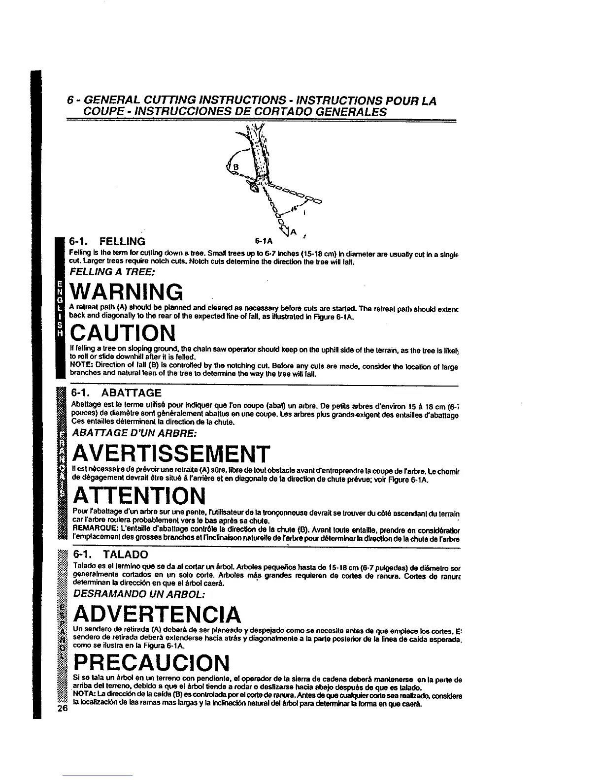 IIesl n_cessaire de pr6voir une relreite (A) sore, lit)rede lout obstacle evant d'entreprendre ta coupe de rerbre. Le chemlr