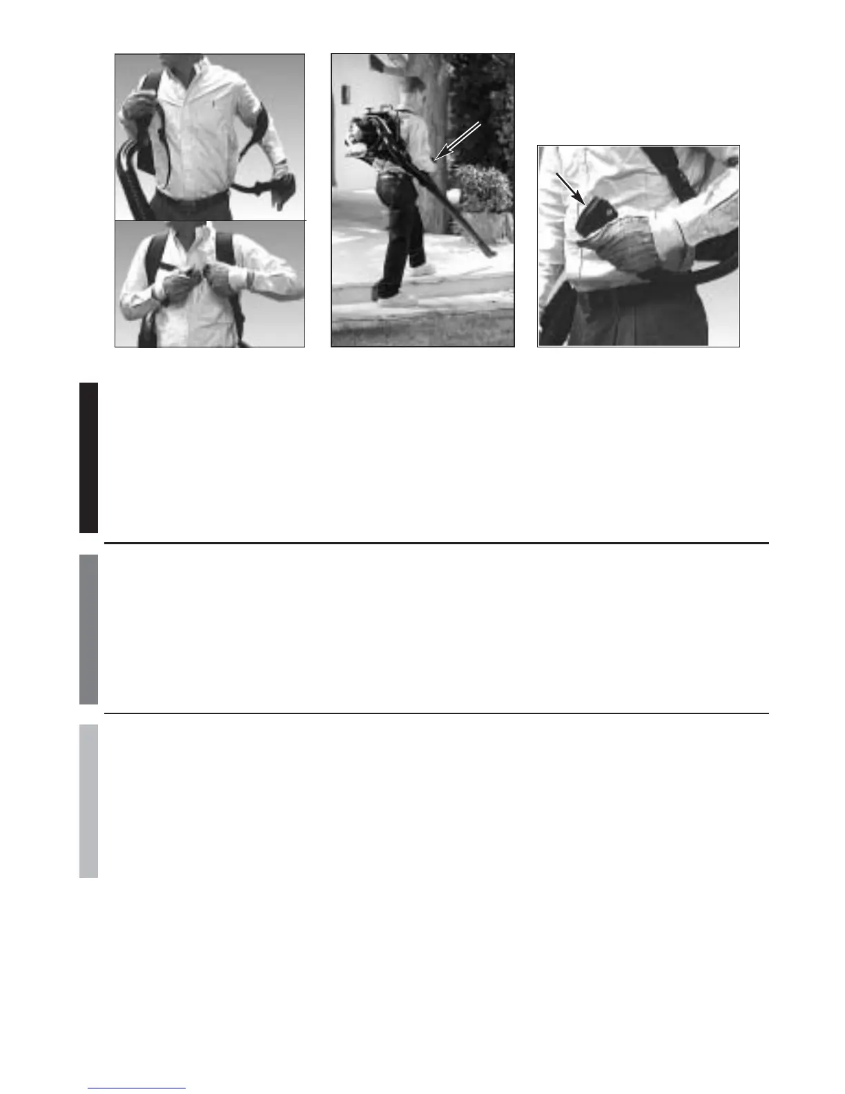 2. Una vez que el motor esté encendido, coloque la unidad en su espalda pasando los brazos a través de las correas de hom-