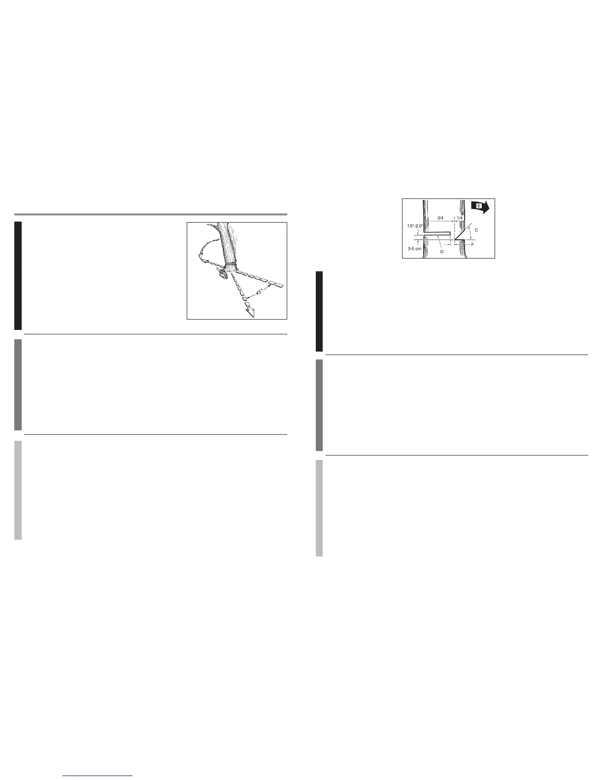 Start making the upper notch cut (C) on the side of the tree facing the felling direction (E). Be sure you don t make the