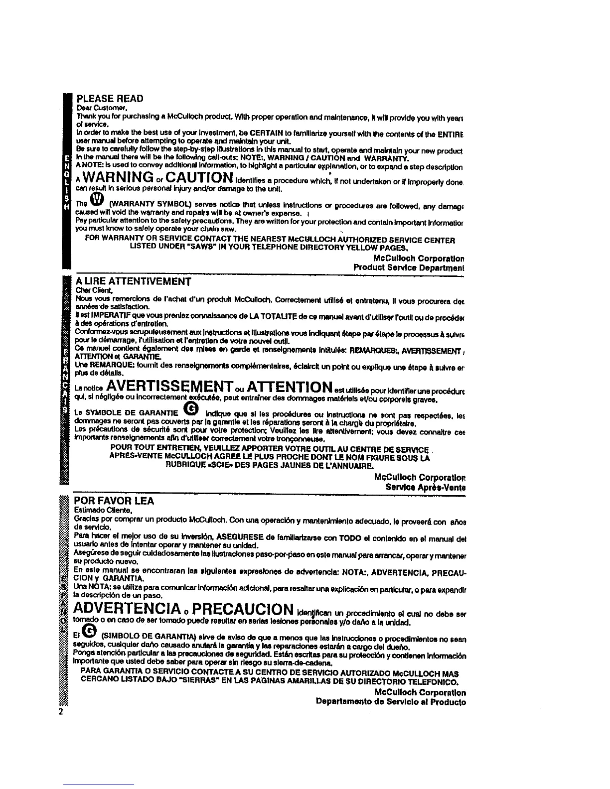 FOR WARRANI_ OR SERVICE CONTACT THE NEAREST McCULLOCH AUTHORIZED SERVICE CENTER