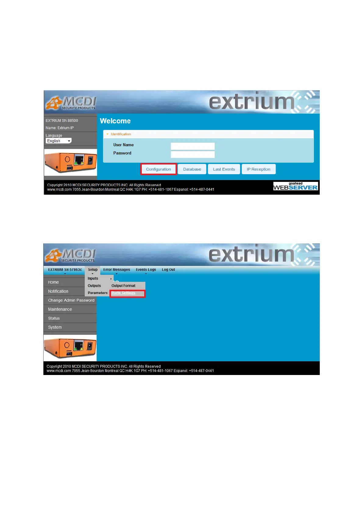 Ports Settings menu