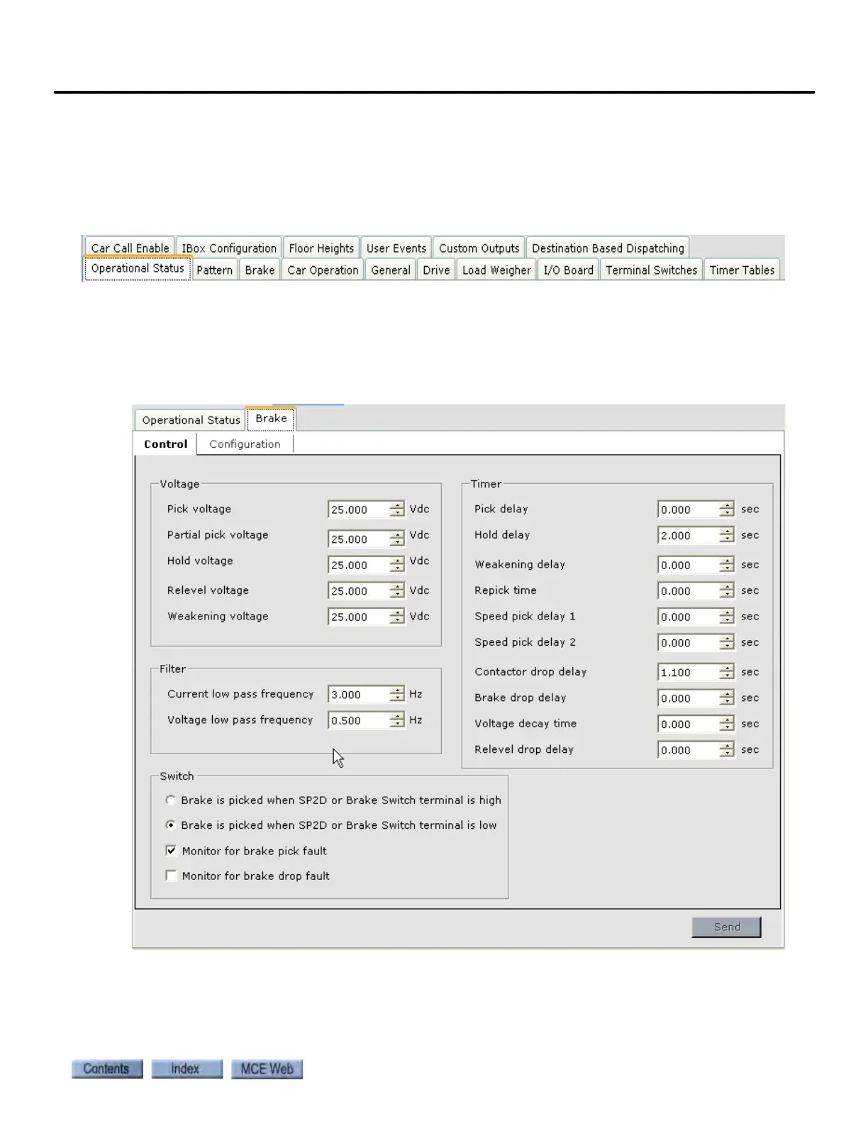 The Configuration > Brake tab is used to set the brake voltage and brake timer parameters.