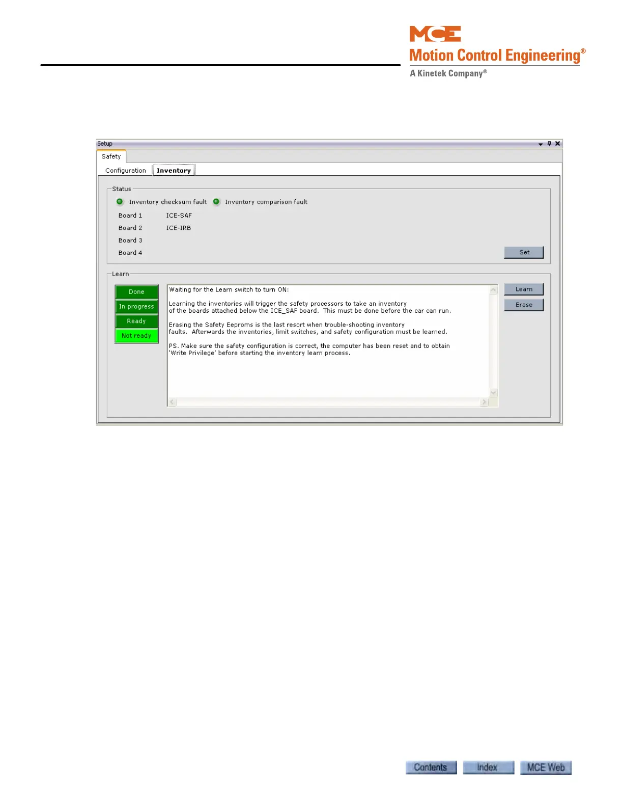 The Inventory tab is used to perform the Safety Inventory Learn procedure. This procedure