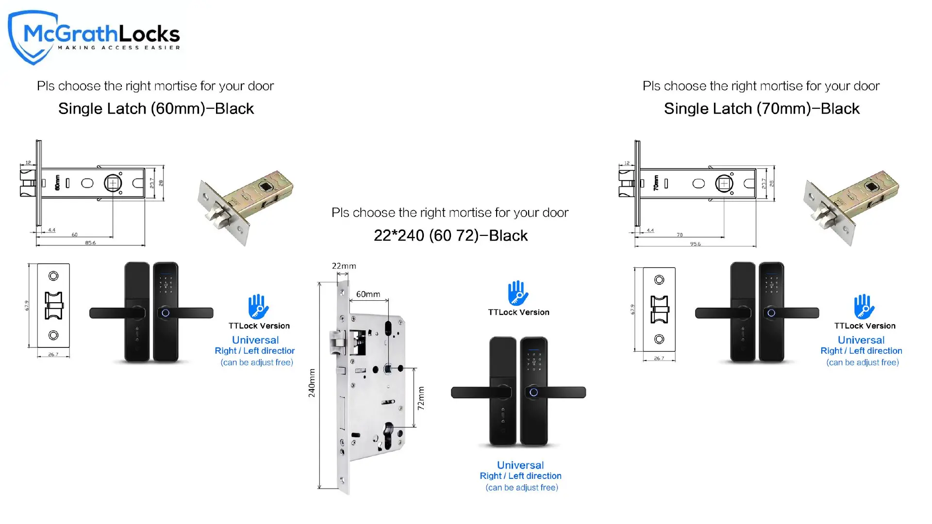 McGrath Locks MLNX5 - Mortise Dimensions and Compatibility; Single Latch 60 mm Mortise; Single Latch 70 mm Mortise; 22 x240 mm Mortise (60;72 mm)