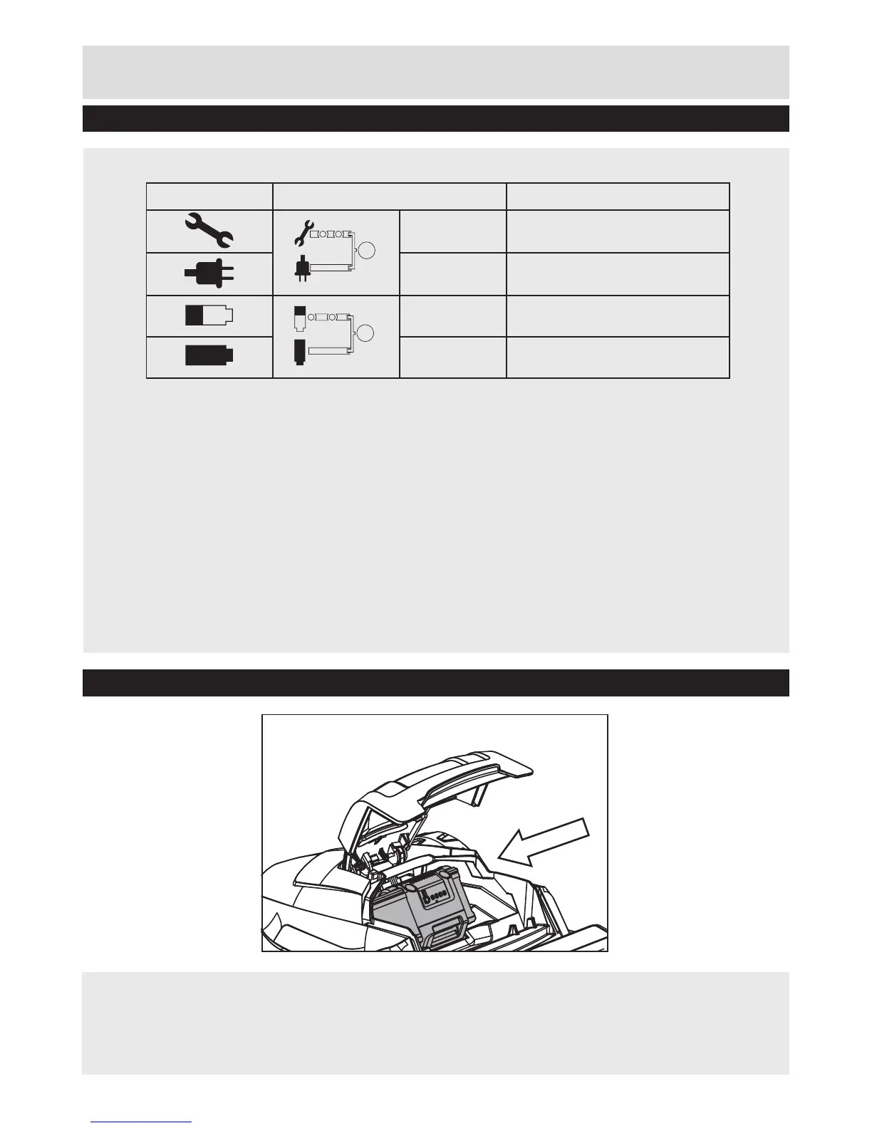 • Lift the battery cover on the lawnmower deck, slide the battery along the guide rails