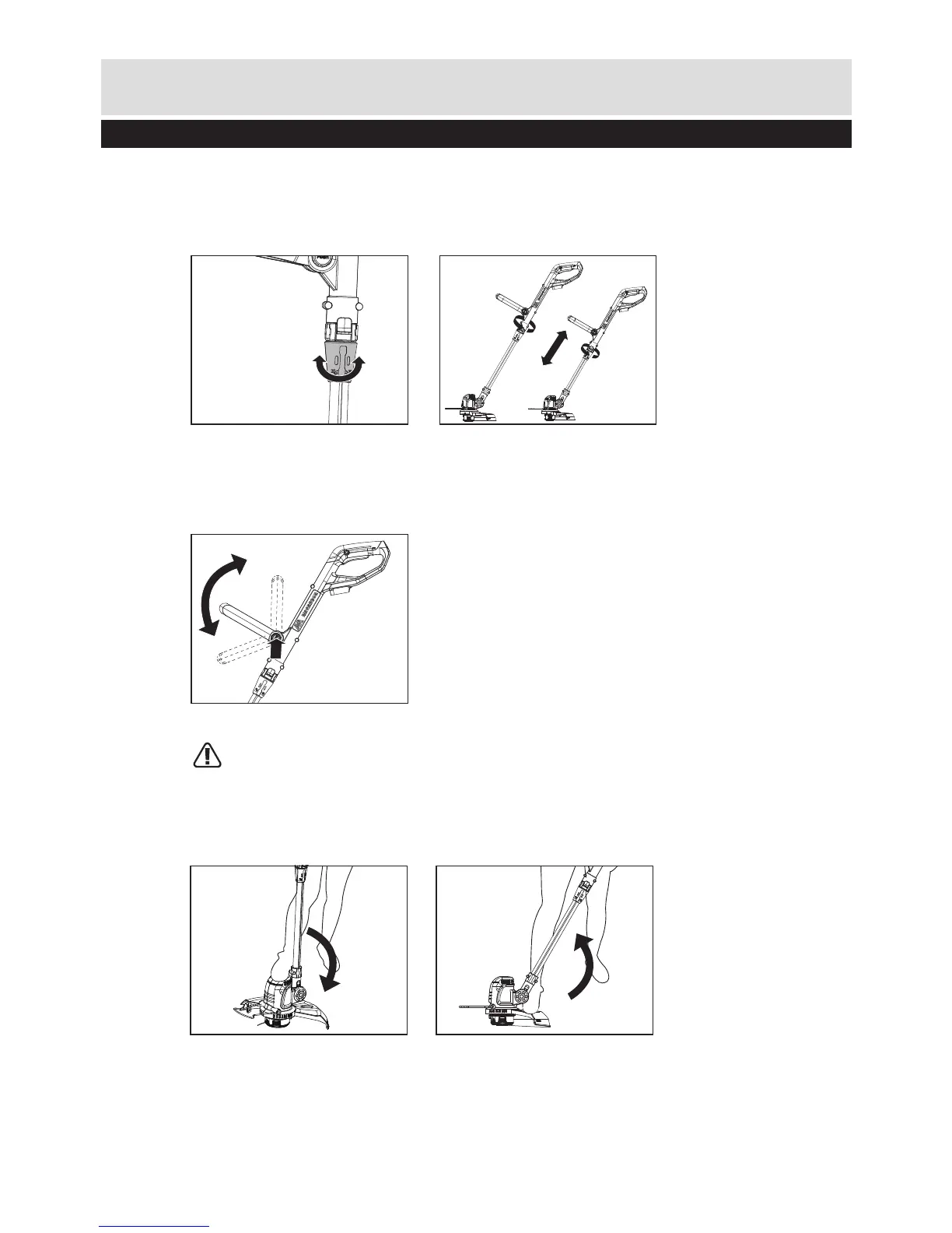 2) Adjust the main handle angle upwards, put one foot on the safety guard area of the trimmer head,