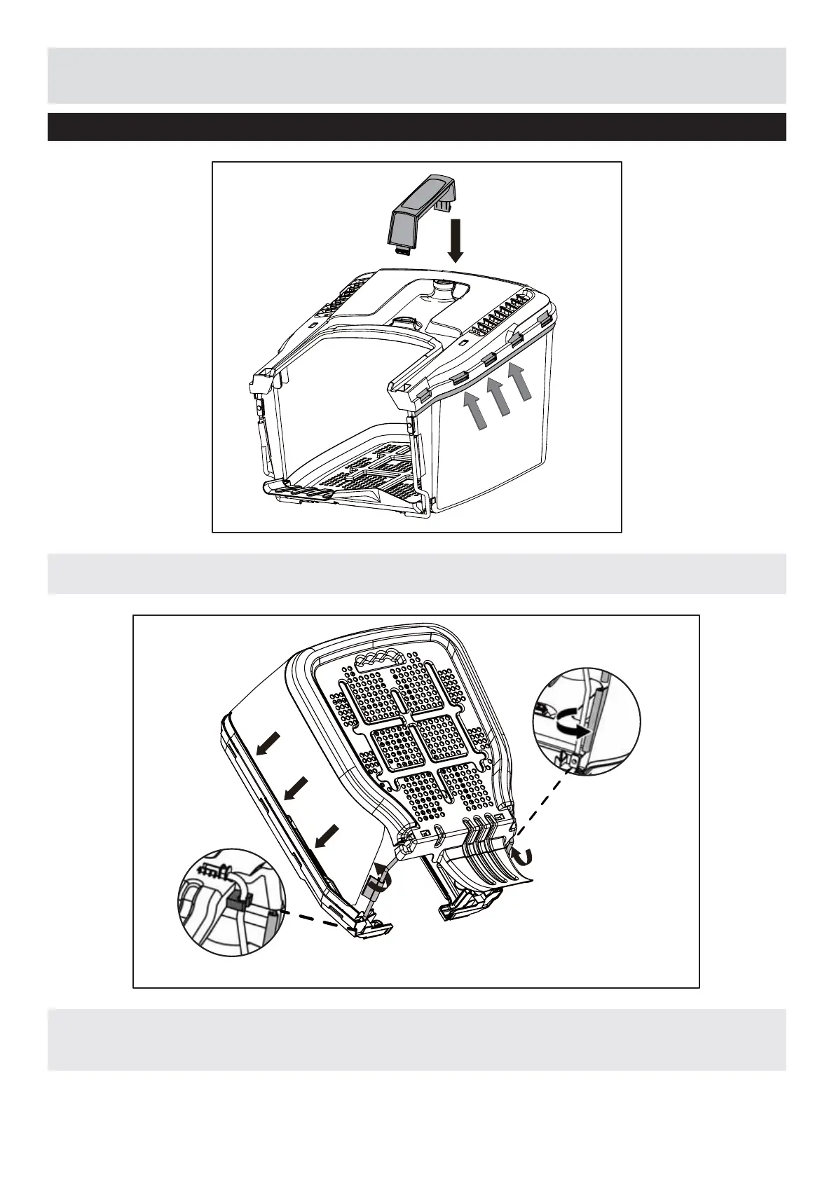 Insert the collector handle into the grass bag, Clip the plastic retainers onto the metal frame.