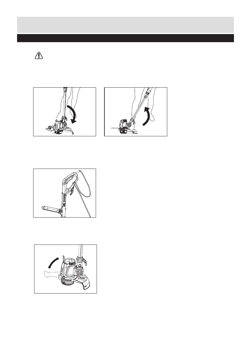 2) Adjust the main handle angle upwards, put one foot on the safety guard area of the trimmer head,