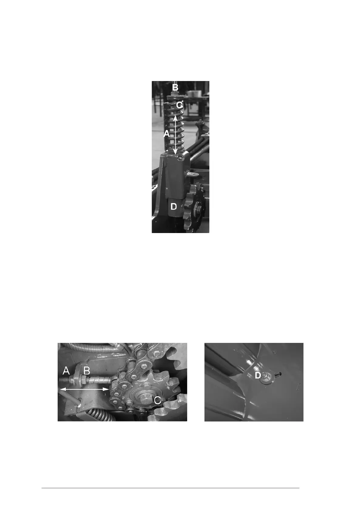 3. Tighten nyloc nut (D) and bolt (C) when the chain is taut, i.e. minimal sag.