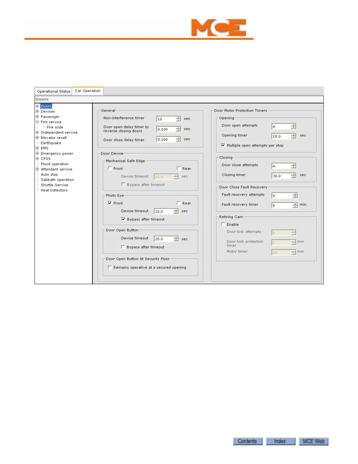 The Doors tab allows you to set bypass timers for elevator safe edge and photo eye devices, set