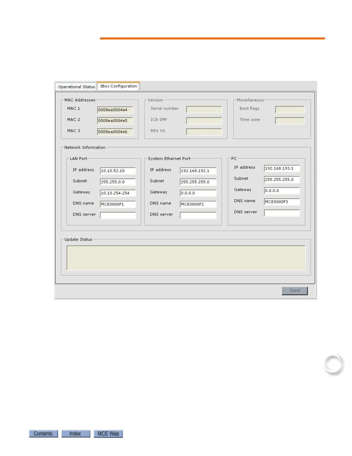 • Network Information: Ethernet information for each of the iBox ports.