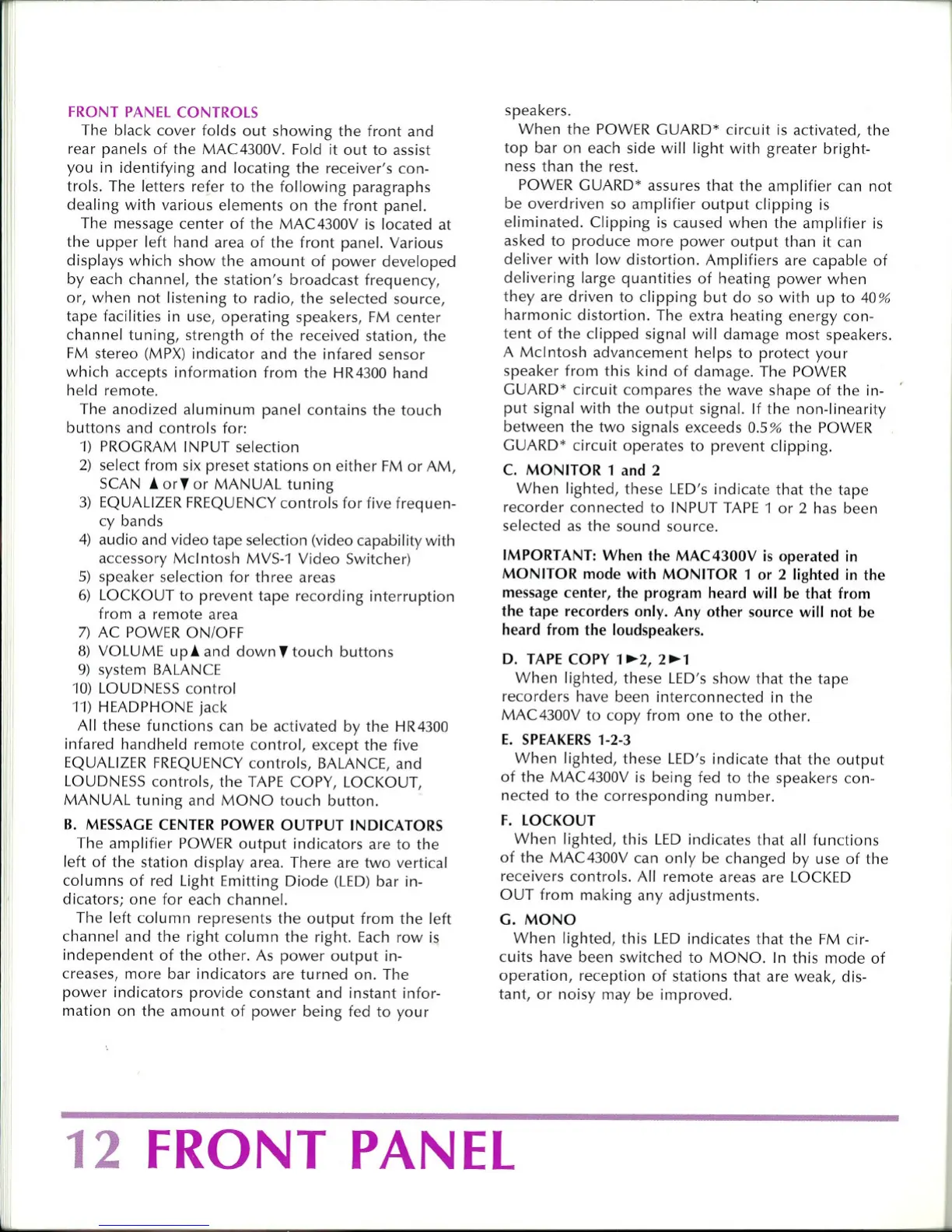 McIntosh MAC 4300V - Front Panel Controls; Message Center and Power Indicators; Input Selection and Tuning Controls; Equalizer and Speaker Selection
