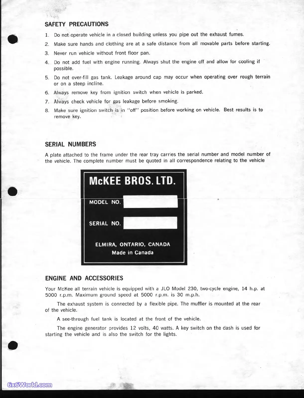 McKee Roughrider - Safety Precautions; Serial Numbers; Engine and Accessories