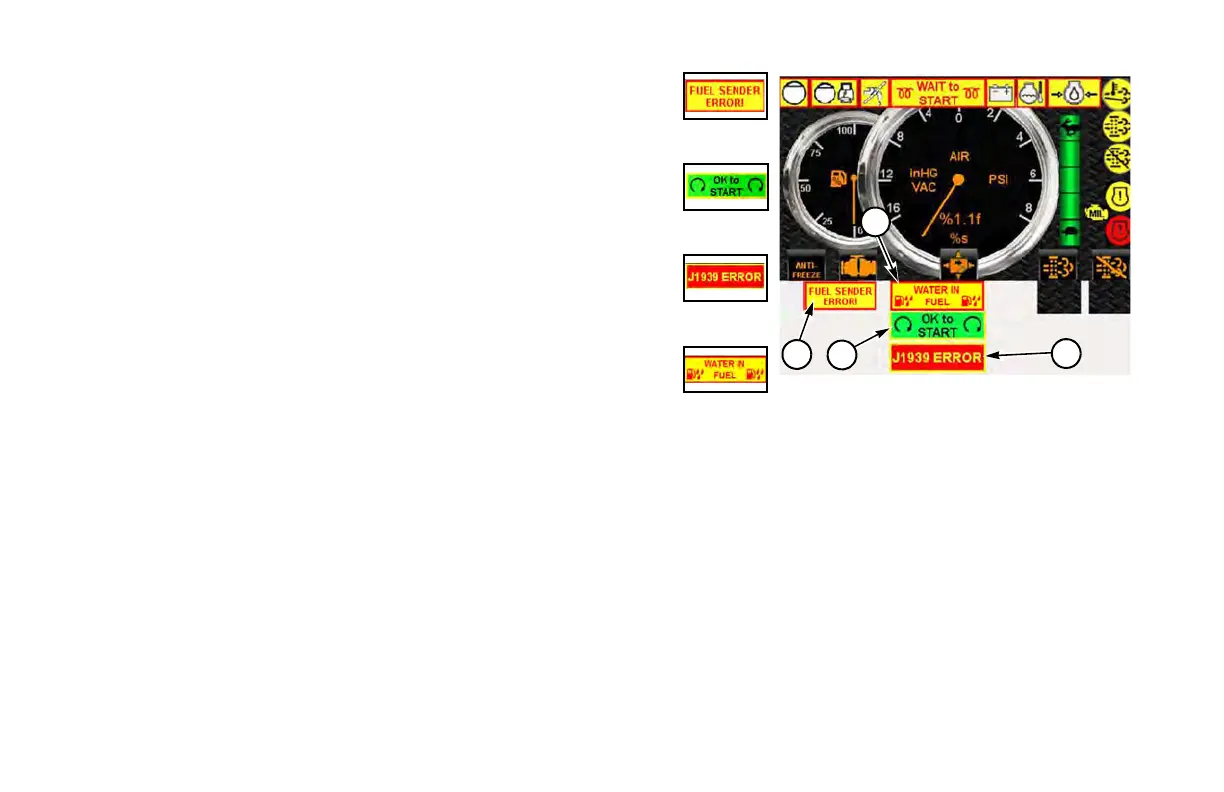 When lit, indicates there is water in the fuel tank. Refer to Engine
