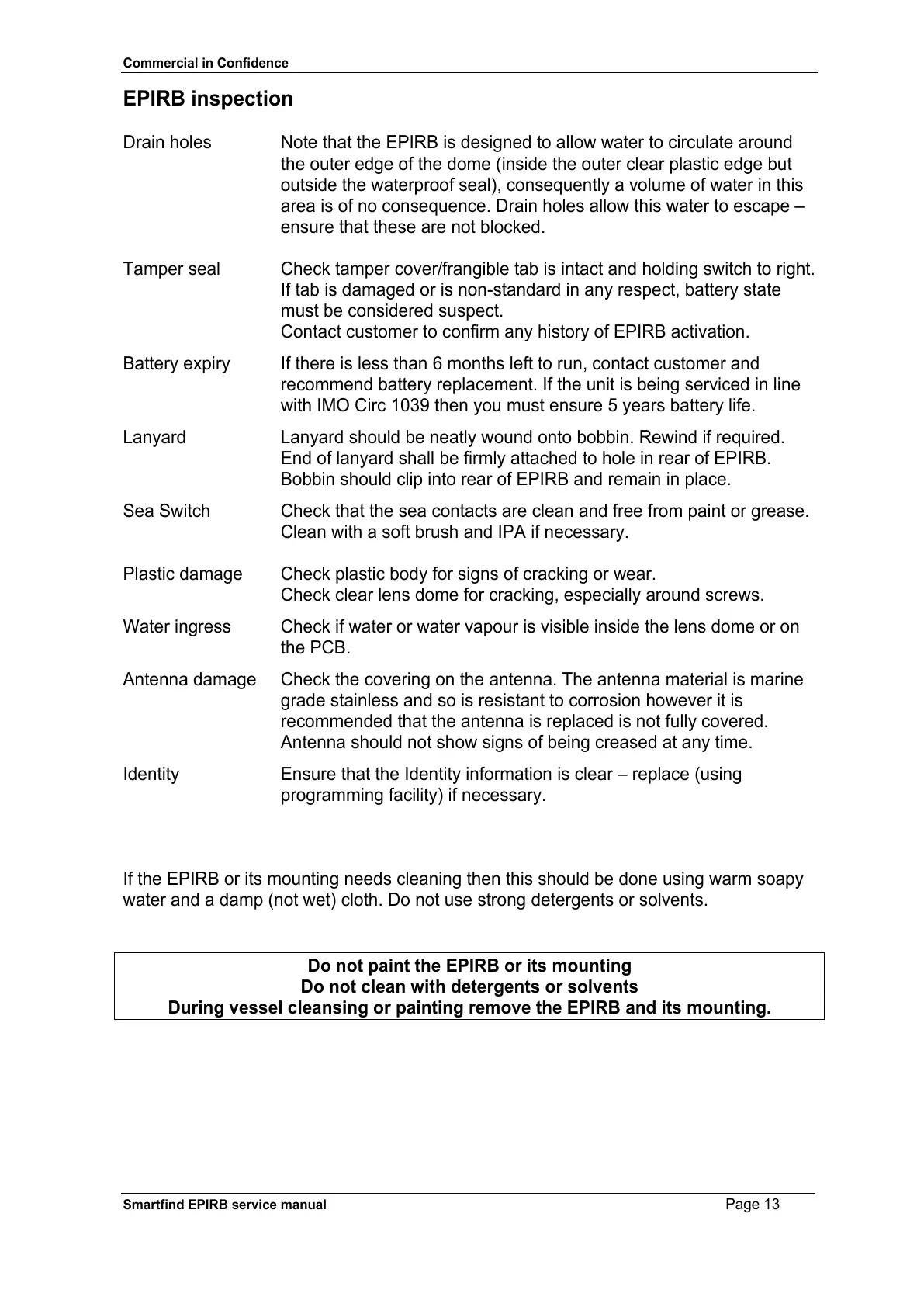 If the EPIRB or its mounting needs cleaning then this should be done using warm soapy