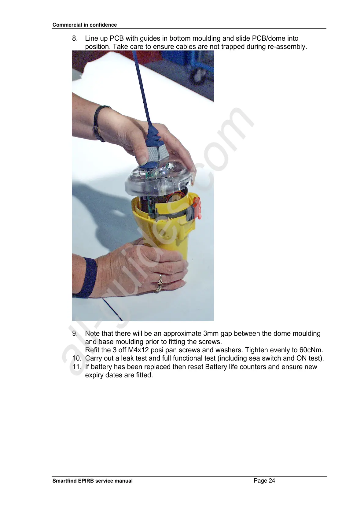 8. Line up PCB with guides in bottom moulding and slide PCB/dome into