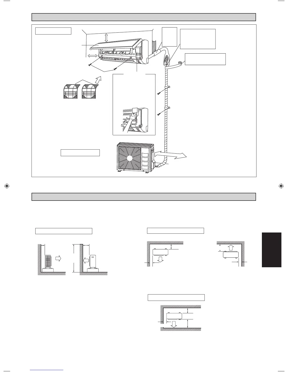Когда на пути впускного или выпускного потока воздуха наружного блока находится стена или другое препятствие,