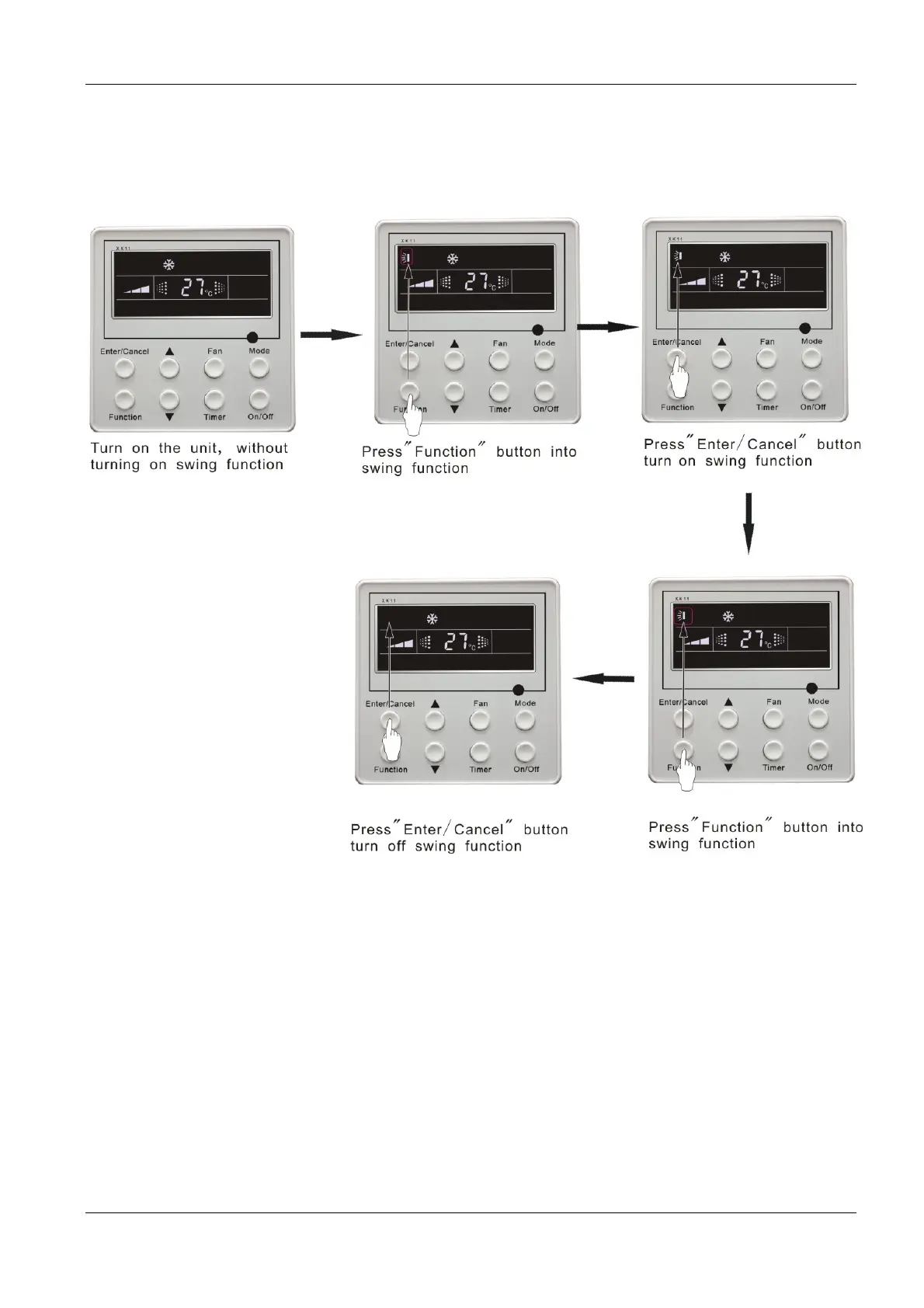Under on-state of unit, press Function button till the unit enters swing control function and then press “Enter/cancel