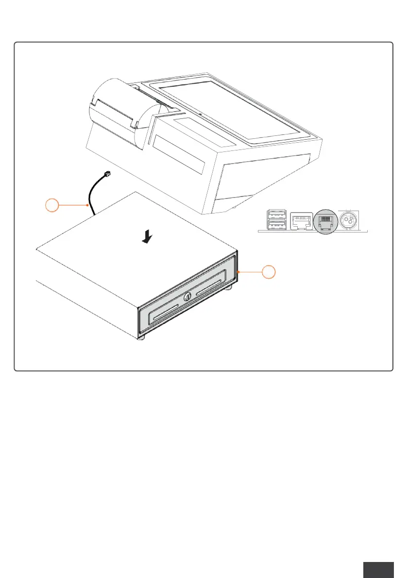 Connect the RJ11 cable (5) of the (optional) cash drawer (6) to ABOX 3;