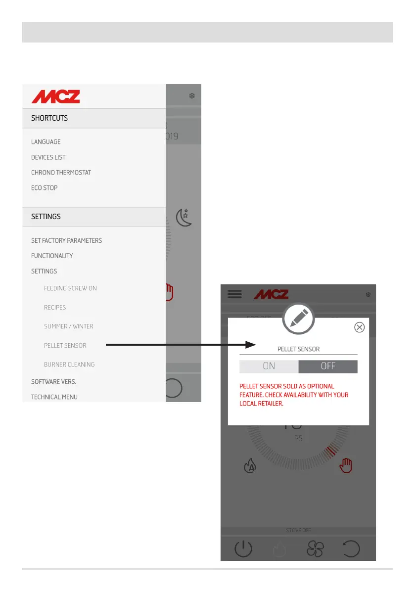 The pellet sensor is used to measure the level of pellets in the hopper. It can be activated from the side menu, SETTINGS after having