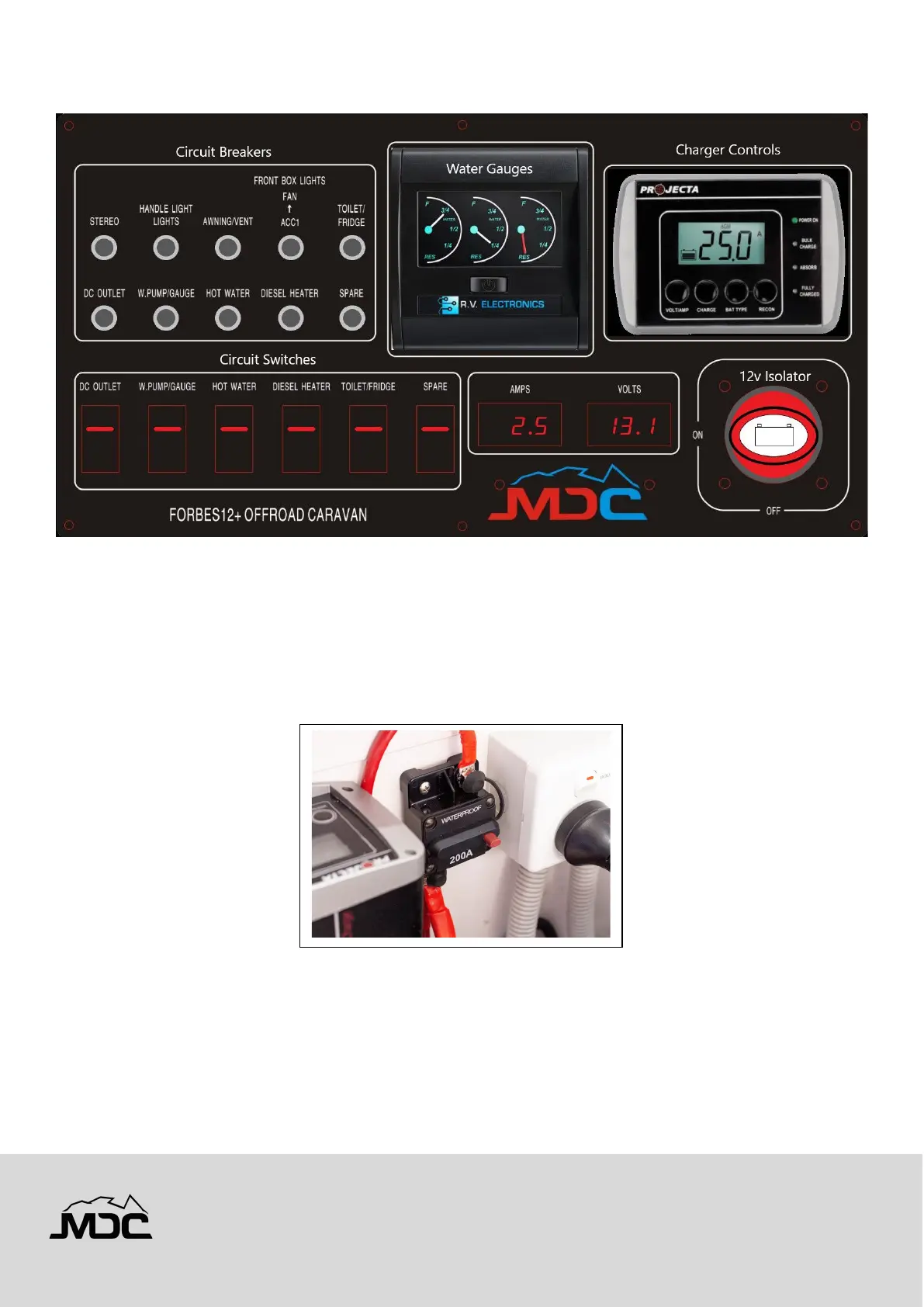 The main 12v circuit breaker is located beneath the dinette seat beside the Projecta battery charger. This 200A