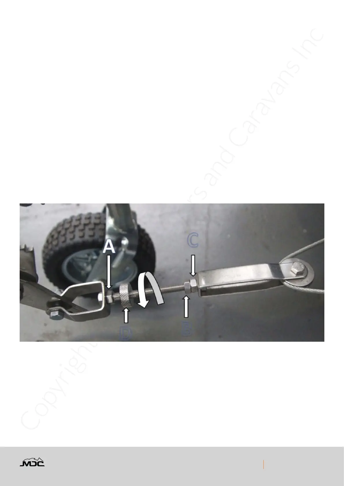 tighten the handbrake cable, turn the adjuster wheel D in a clockwise direction. Once adjusted retighten lock nuts