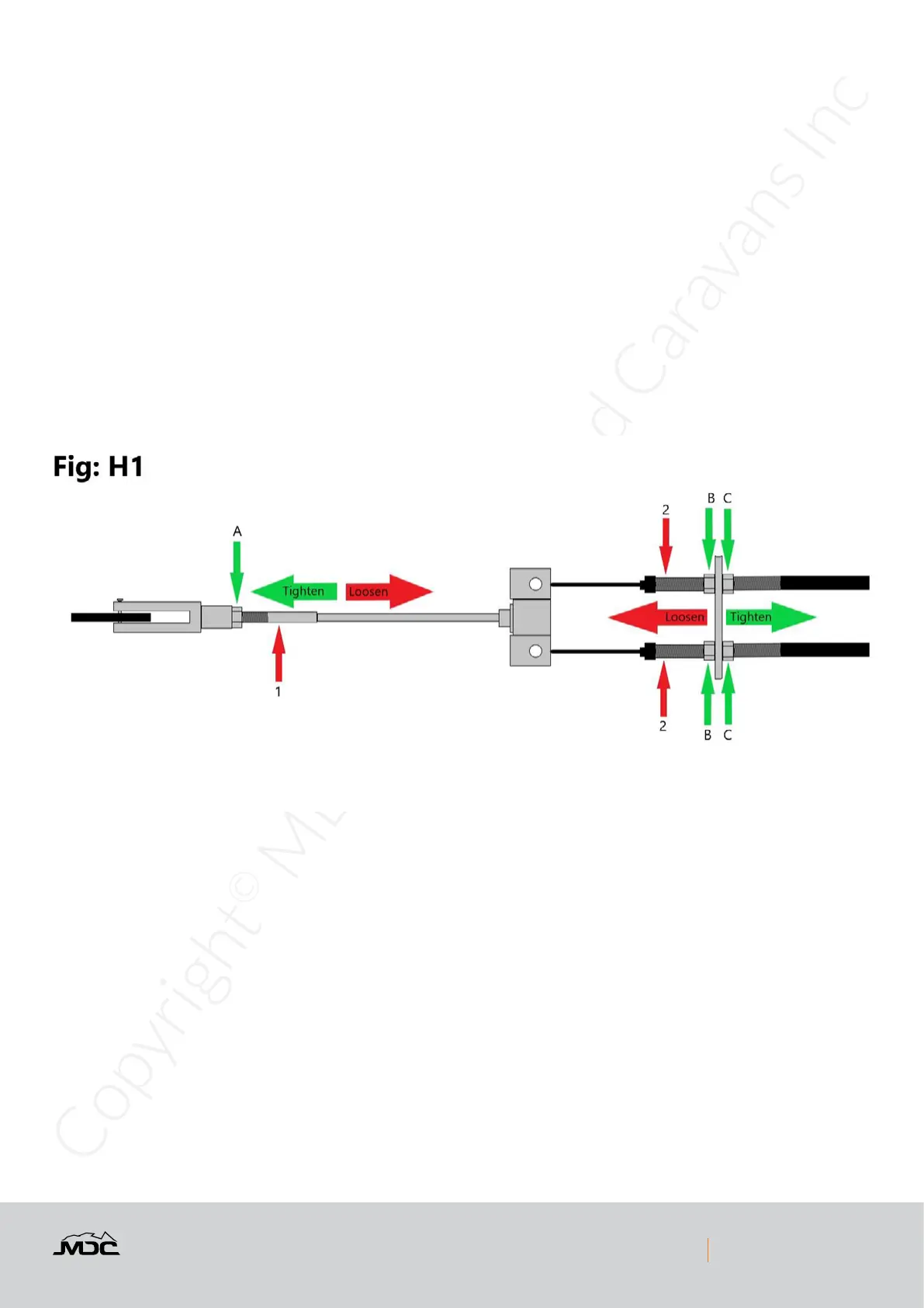 3. Turn locknut B clockwise towards the backing plate while loosening locknut C to reduce handbrake.