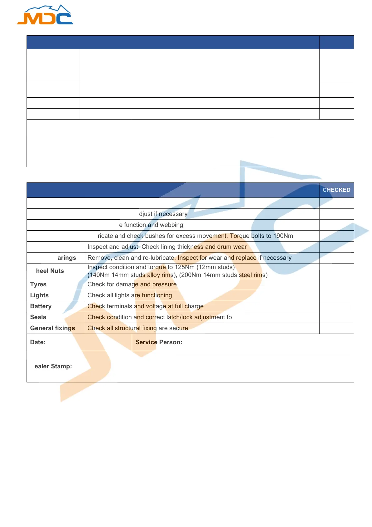 Hitch Check hitch bolts to 76Nm. Lubricate with high temp bearing grease