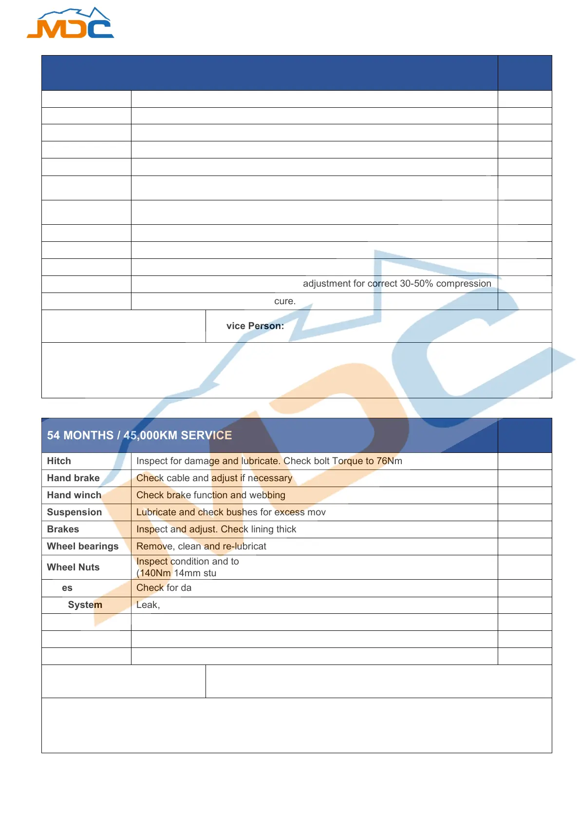 Hitch Inspect for damage and lubricate. Check bolt Torque to 76Nm