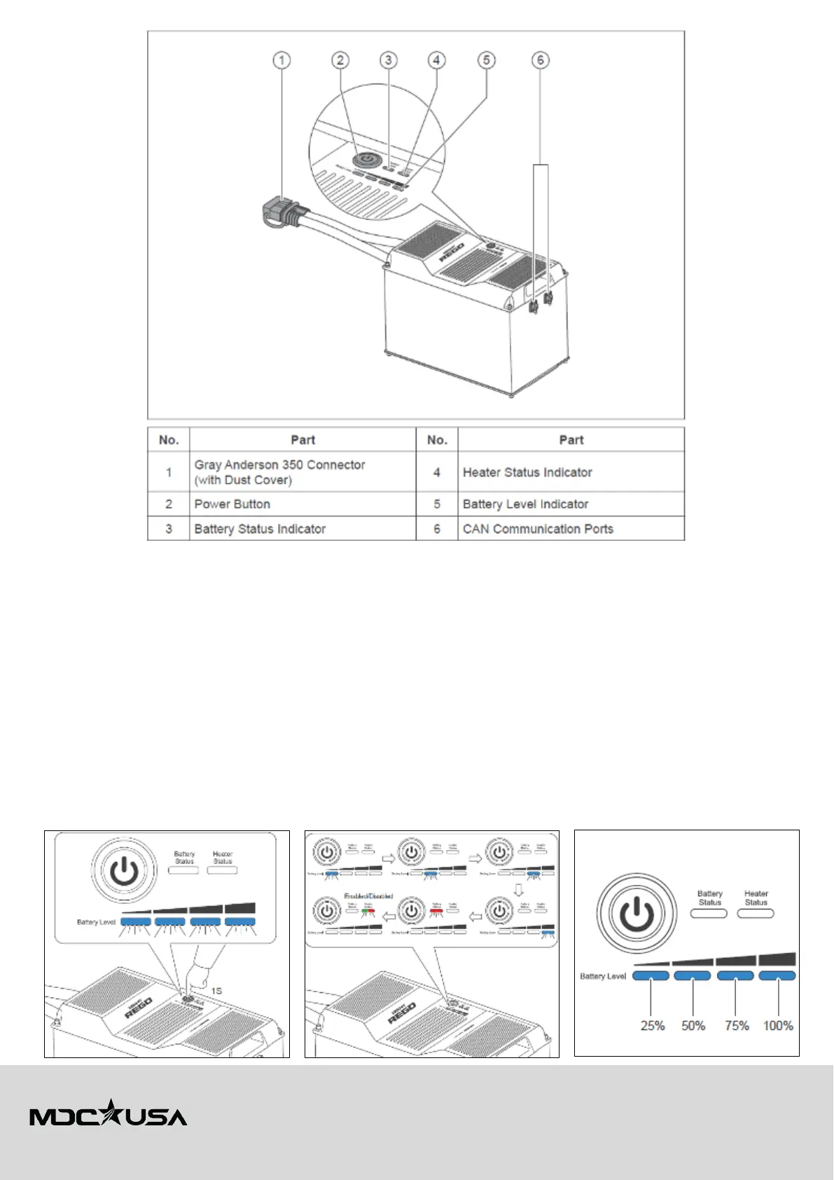 3. Observe the battery level indicators. The Battery Level Indicators, Battery Status Indicator, and Heater Status Indicator