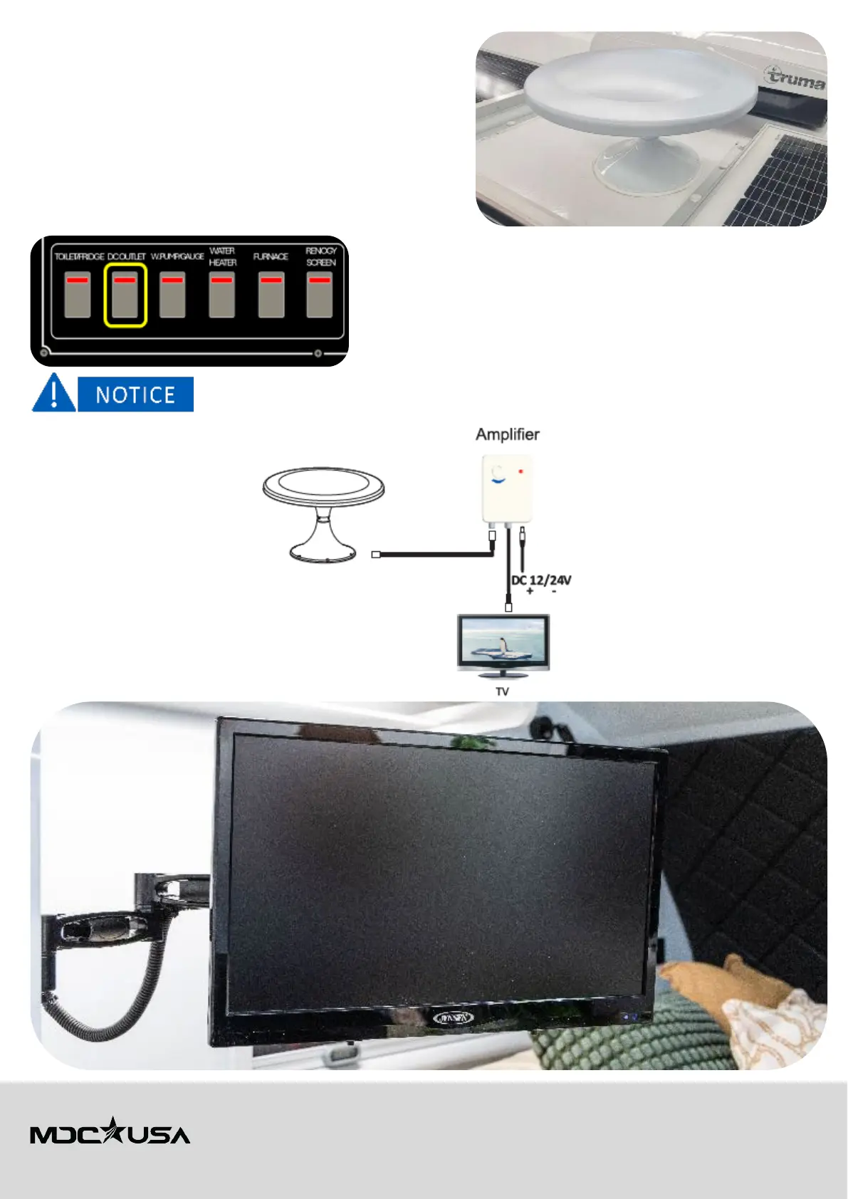 1. Supply 12V power to the amplifier and TV, by switching on the DC